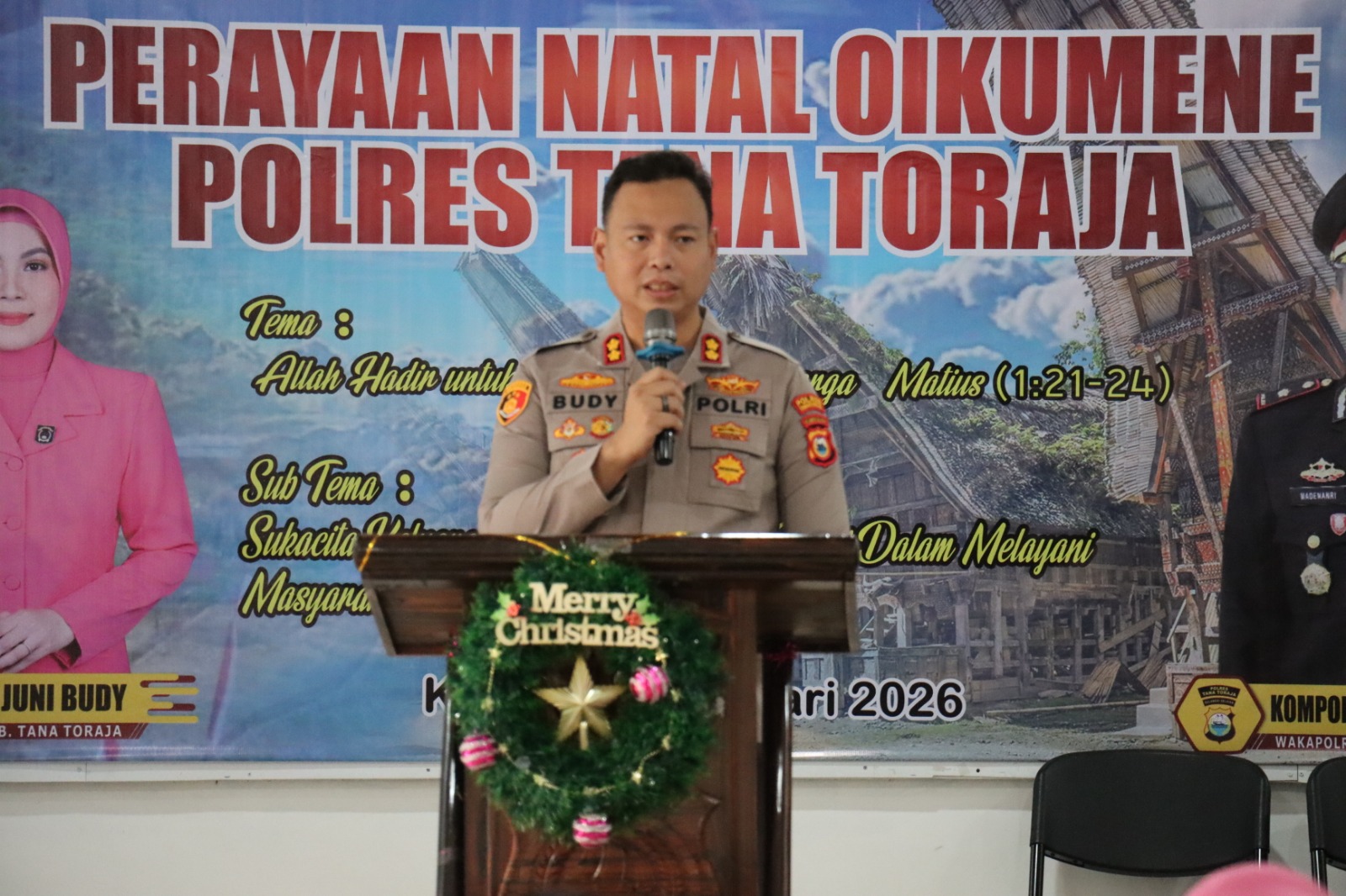 Kapolres Tana Toraja AKBP Budi Hermawan dalam sambutannya menyampaikan bahwa perayaan Natal Oikumene ini tidak hanya menjadi momentum untuk meningkatkan keimanan dan ketakwaan kepada Tuhan Yang Maha Esa, tetapi juga sebagai sarana memperkuat semangat pengabdian, pelayanan, dan integritas personel Polri dalam menjalankan tugas kepada masyarakat.