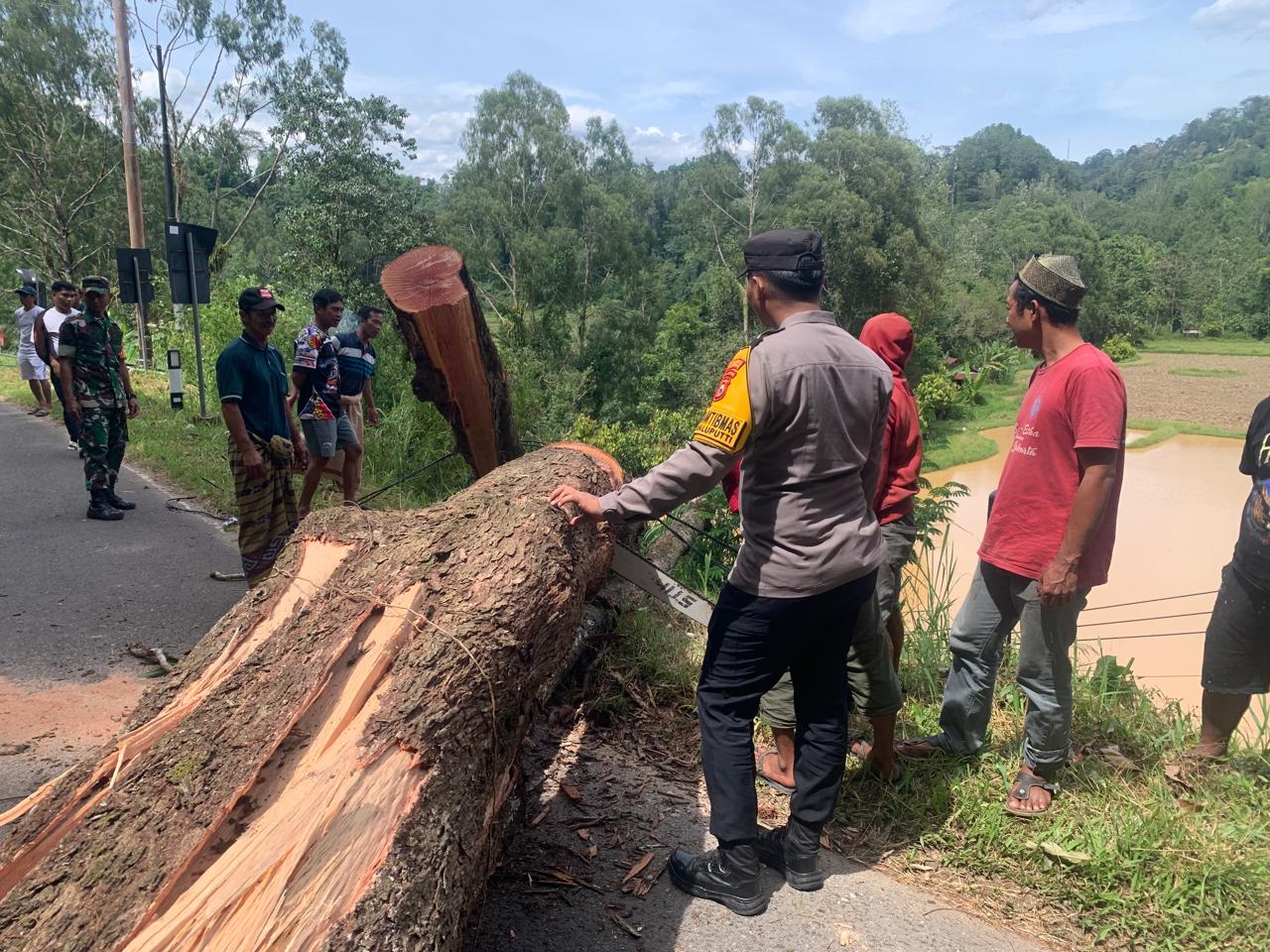 Menindaklanjuti informasi dari warga, personel Polsek Saluputti segera mendatangi lokasi kejadian pohon tumbang dan berkoordinasi dengan Babinsa serta masyarakat setempat untuk melakukan pembersihan. Melalui kerja sama dan gotong royong menggunakan gergaji mesin, batang pohon berhasil dipindahkan ke pinggir jalan.